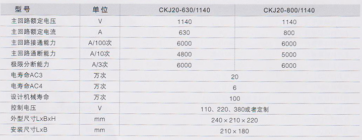 CKJ20-630(800)/1140型交流低壓真空接觸器使用于交流50HZ,主回路額定工作電壓到1140V,額定工作電流至600A的電流系統(tǒng)中,供遠距離接通與開斷電路及頻繁地起動和控制交流電動機用。并適宜于與各種保護裝置組成磁力啟動器,具有電弧不外露等特點。特別適用于組成防爆磁力啟動器。適用于煤礦或石油等行業(yè)。
